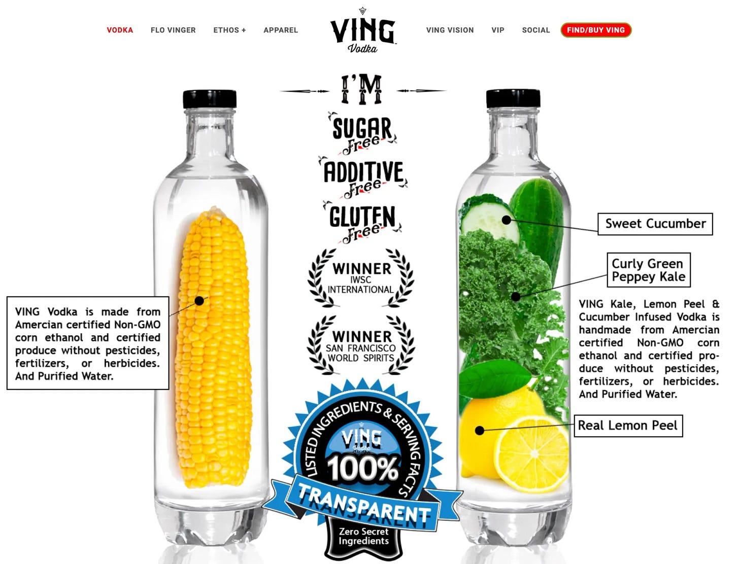 Take Ving Vodka (“The world’s cleanest vodka”), which is sugar-, additive- and gluten-free, made from non-GMO corn ethanol without pesticides, fertilizers or herbicides, and infused with lemon peel, sweet cucumber and curly green kale: