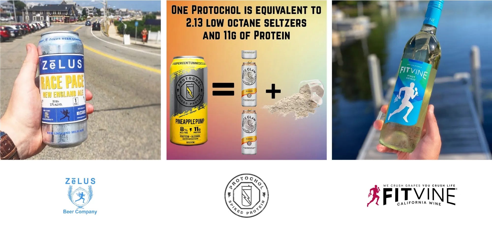 Some brands even seek to associate themselves with sport and activity — transcending passive sponsorship (Guinness × Six Nations Rugby; Bud Light × NFL) to speak directly to consumer fitness. For example: the Zelus Beer Company (“Crafted for you to enjoy after your zealous endeavors”); Protochol spiked protein beverages (“For the bravest of people who flaunt their savagery”); Samuel Adam’s “Boston Marathon” 26.2 Beer (“The kind of brew we all crave after intense long-distance running”); and FitVine Wine — whose logo is a runner grasping a bunch of grapes and lifting a wine glass to his lips.
