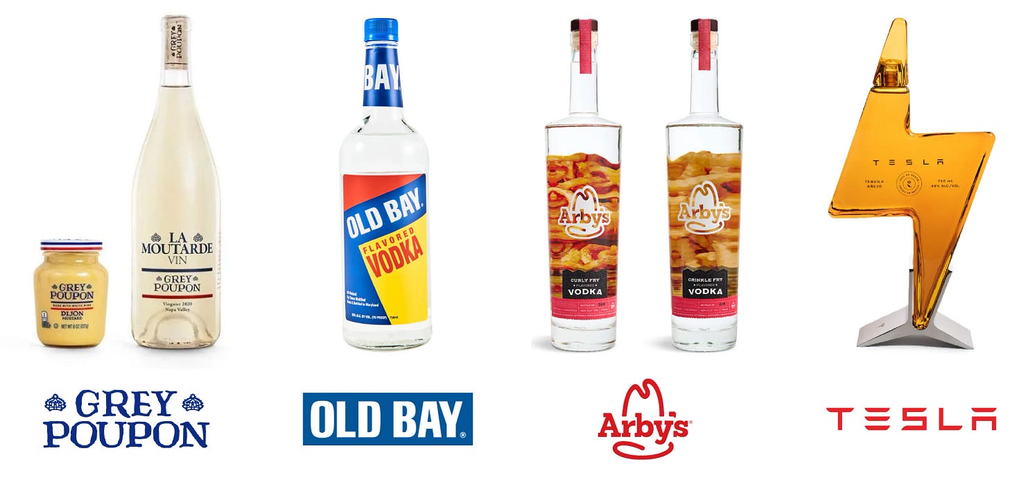 But alcoLOL is now just another gimmick in marketing’s click-bait playbook. In the past few years, Grey Poupon released La Moutarde Vin, a limited-edition mustard-infused white wine; French’s launched a mustard beer with Oskar Blues; McCormick launched Old Bay Vodka; Oreo announced a limited edition Barefoot red blend wine; Cheez-It launched three limited-edition wine collaborations; Red Lobster began cocktailing the Mountain DEWGarita, the first in a series of Pepsi collaborations; Arby’sdistilled two French-fry-flavored vodkas (“curly” and “crinkle”); and, in a jump of the snark that was funnier than likely intended, Elon Musk took a shot at Tesla Tequila.