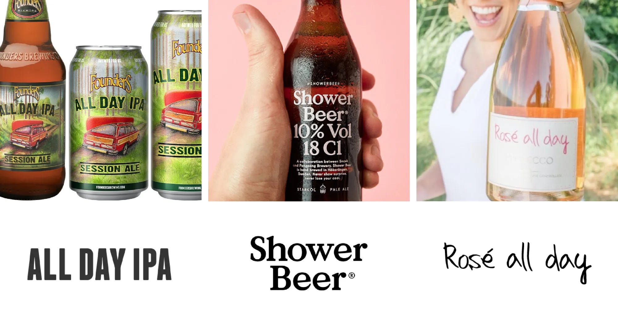 Several brands address ambient drinking head on, including: All Day IPA (“The beer I can have all the time, all day”); Shower Beer(“Specifically made to be enjoyed in the shower”); and Rosé All Day wine (“Catchphrase / Lifestyle / Phenomenon”).