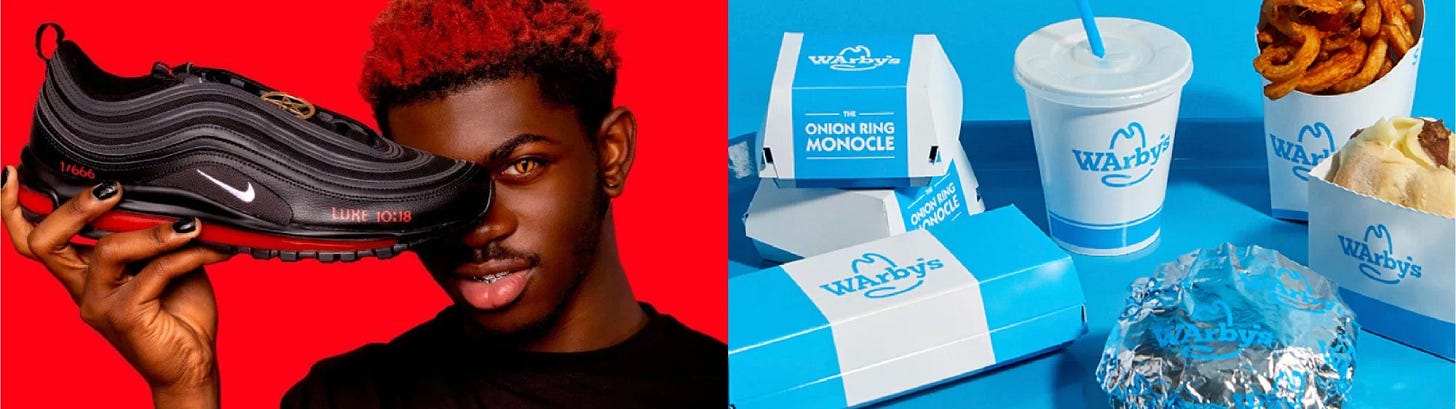 Shock is well-illustrated by the collaboration between the rapper Lil Nas X and the art collaborative MSCHF which created 666 pairs of Satan Shoes by “customizing” Nike Air Max 97s with (what they claimed was) human blood. And guffaw is illustrated by the midlarious April Fool’s Day stunt collaboration between Warby Parker and Arby’s.