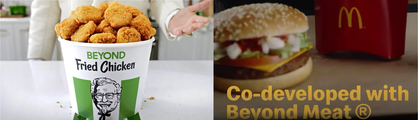 Beachheading has also influenced the latest collaborations between fast food and faux meat. Last year Impossible Food launched a “restaurant concept” with the Dog Haus hot dog chain, and Beyond Meat agreed to produce plant-based products for McDonald’s, KFC, Pizza Hut and Taco Bell. Such collaborations allow legacy food brands to test the waters of alternative protein, while introducing meatless pioneers to a captive audience of curious carnivores. Clearly it’s in both parties’ interests that such co-produced innovations are boldly co-branded: