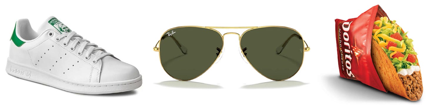 Brand collaborations arise when two or more boldface entities unite to promote or produce a product or service. As such, the collaborative spectrum covers everything from simple celebrity endorsements (Stan Smith × Adidas) and product placement (Ray-Ban × “Top Gun”) to complex co-creations (FritoLay × Taco Bell).