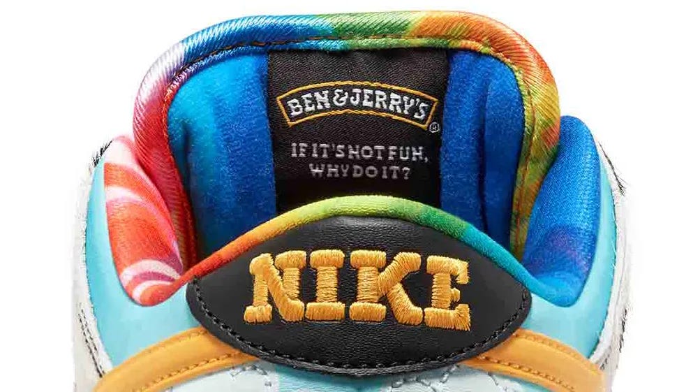 And this may be no bad thing. Collaborations add not just to consumer choice and the bottom line, but to the gaiety of nations. As the tongue tag of Nike × Ben & Jerry’s “Chunky Dunky” sneaker proclaims: “If it’s not fun, why do it?”