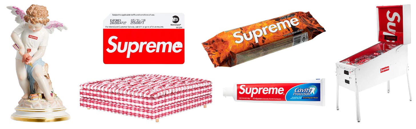 The undisputed master of the lampoon collab is, surely, Supreme which seems to be on a quasi-parodic quest to discover if there is anything it can co-brand that won’t sell out in seconds. This quest has given the world Supreme × Hohner harmonicas, Braun calculators, Stern pinball machines, Ludens cough drops, Colgate toothpaste, Duraflame fire logs, Meissen figurines, Rawlings baseball bats, Hastens beds, MTA metro cards and many, many more.