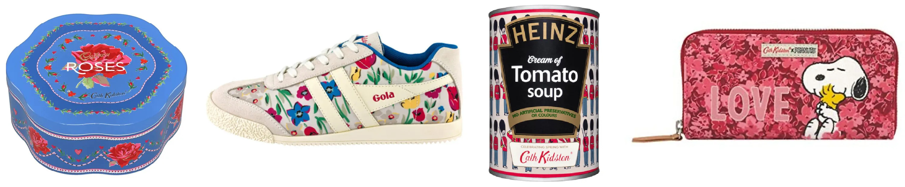 And the retro British homeware company Cath Kidston has overlaid its designs onto an array of “brands whose ethos we share” — including food manufacturers (Roses Chocolates, Heinz), footwear (New Balance, Gola) and children’s fiction (Mr. Men, Disney, Alice in Wonderland, Peanuts, Harry Potter, Beatrix Potter, Moomins).