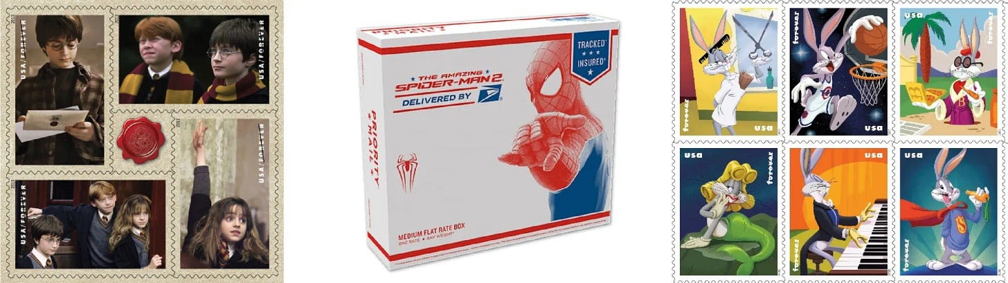 At the subtler end of the sensation spectrum are collaborations that carry the imprimatur of authority — most obviously, partnerships between brands and nation-state stamps, such as the United States Postal Service × Harry Potter, Spider Man, Bugs Bunny and Star Wars (released, inevitably, on May 4th, 2021).