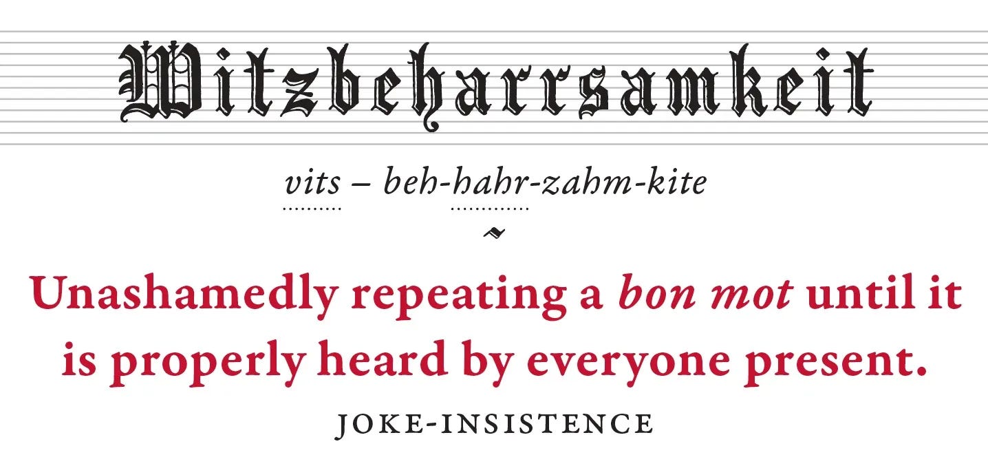 The Germans [should] have a word for it Witzbeharrsamkeit — “joke insistence” — or “unashamedly repeating a bon mot until it is properly heard by everyone present.”