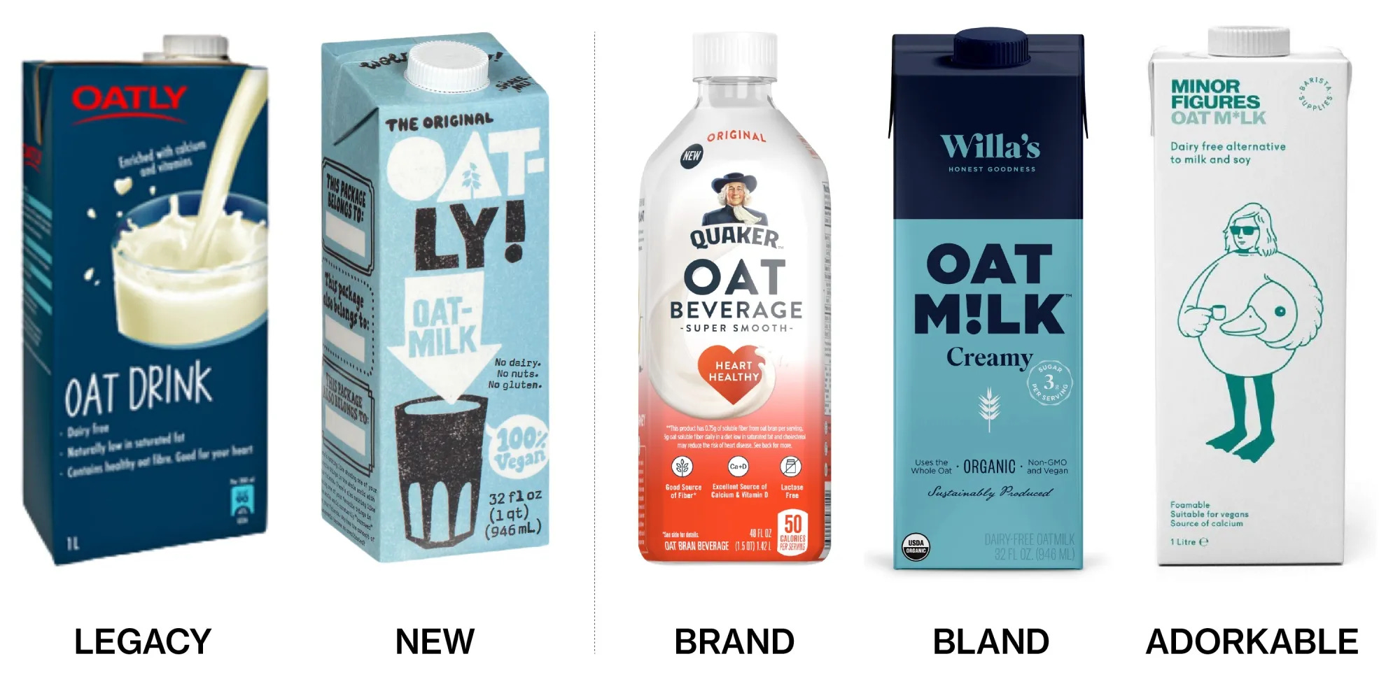 But Oatly’s brandtering barrage must also be read contextually, both as a rejection of its own clichéd legacy branding, and as a reaction to the competing semiotics of Boomer brands (Quaker Oat Beverage), Millennial blands (Willa’s) and Gen-Z adorkables (Minor Figures).