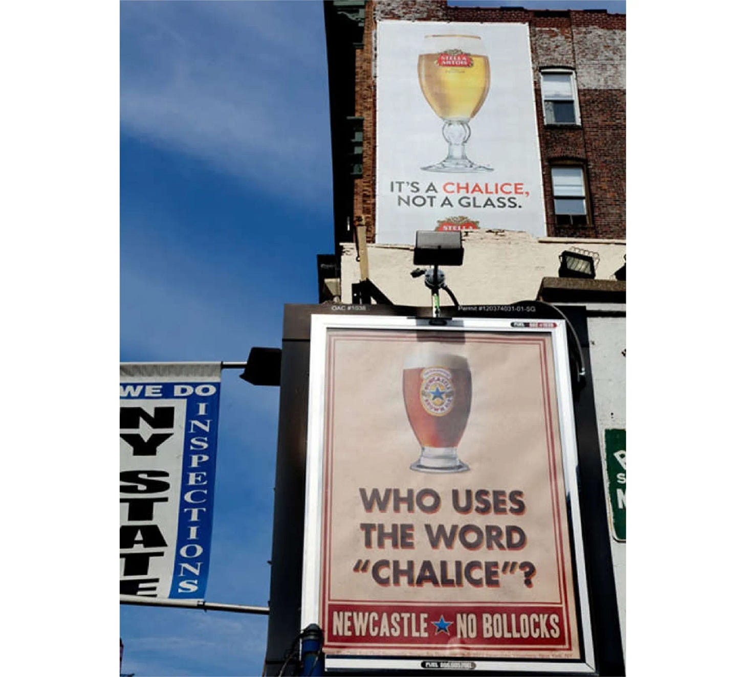 Such brandwagon-jumping is the driving force of brandinage — zingers abhor a vacuum — and while it is ideal for the fleeting rough and tumble of social media, it works also IRL, as demonstrated by Newcastle Brown Ale’s billboard smackdown of Stella Artois: