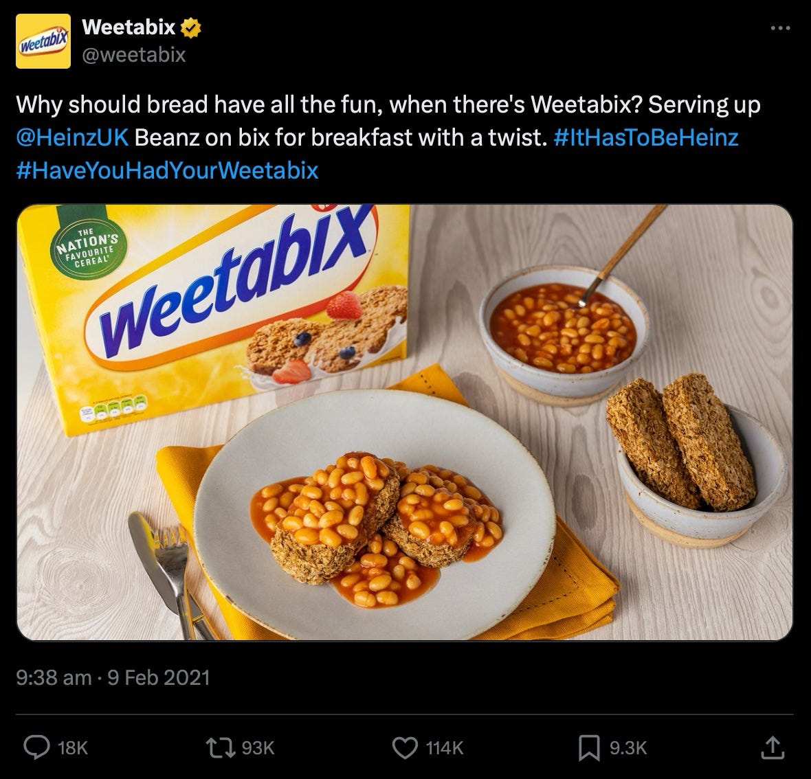 But for the majority brands, brandinage is a hit-and-miss affair — arriving, like true virality, out of the blue. In February 2021, for example, Weetabix tweeted an image of Heinz beans atop its cereal …