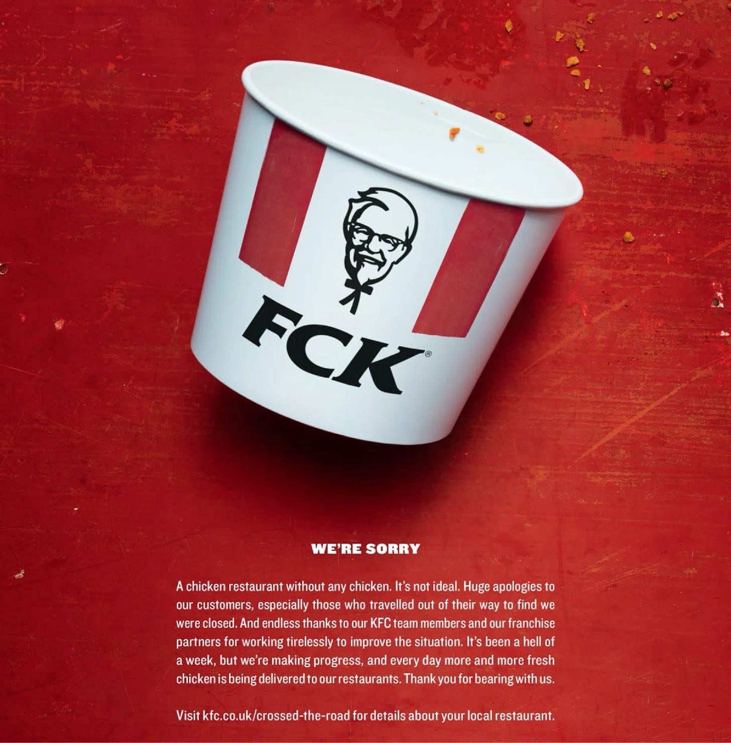 And in 2018, KFC apologized to British consumers for running out of chicken with a witty play on birds: