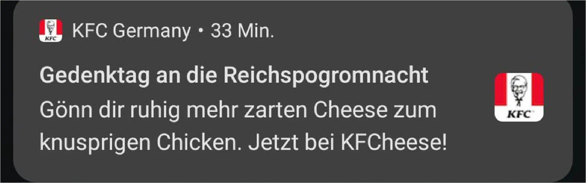 Furthermore, not all anniversaries suit tacticality. In November 2022, KFC blamed an “automated push notification … linked to calendars that include national observances” for a tweet to German customers that announced: