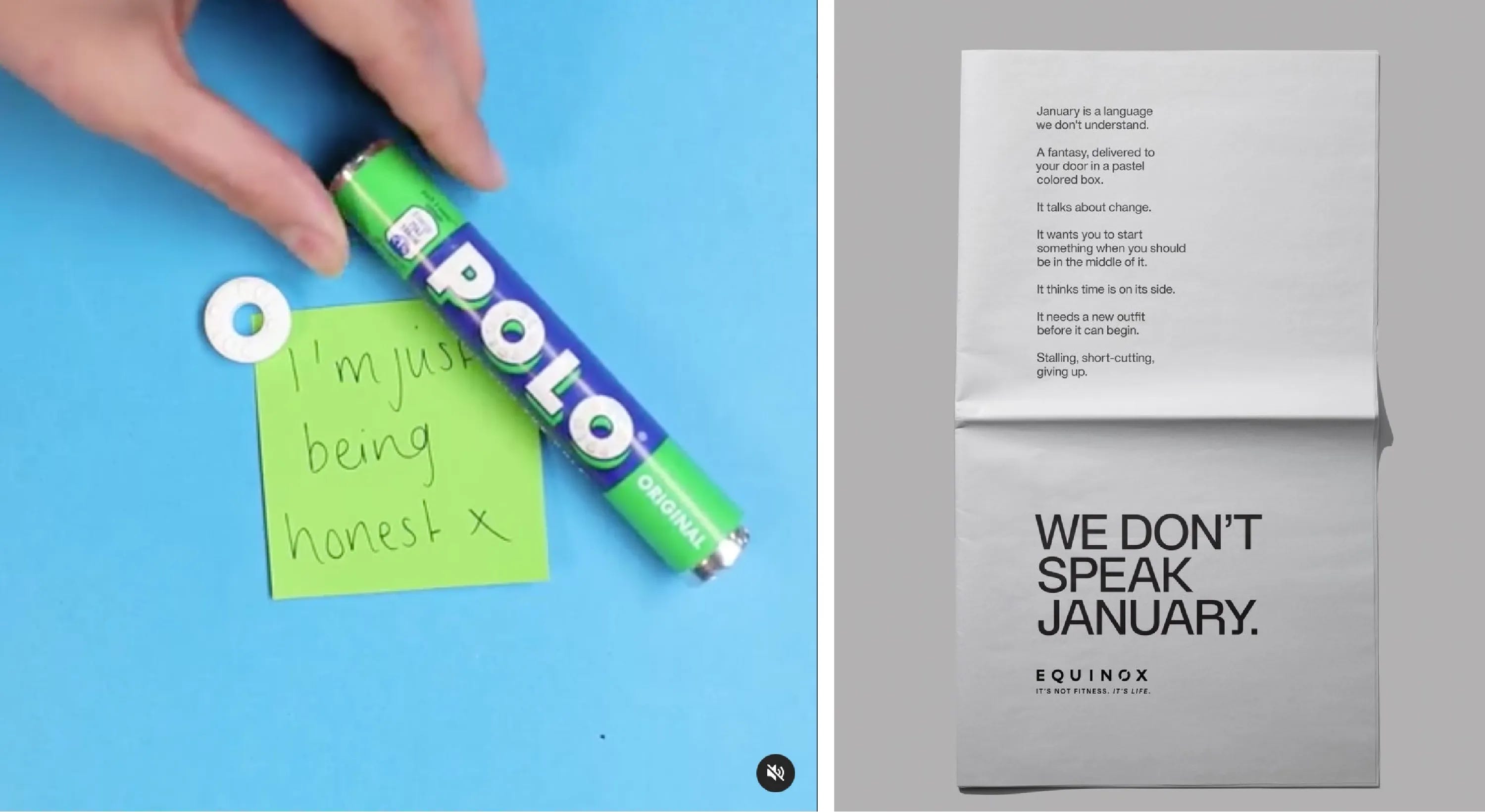 The confectionary brand Polo borrowed “National Honesty Day” (April 30) to promote gifting its mints to those with bad breath. And Equinox banned anyone from joining its gyms on January 1, 2023, because “You are not a New Year’s resolution. Your life doesn’t start at the beginning of the year.”