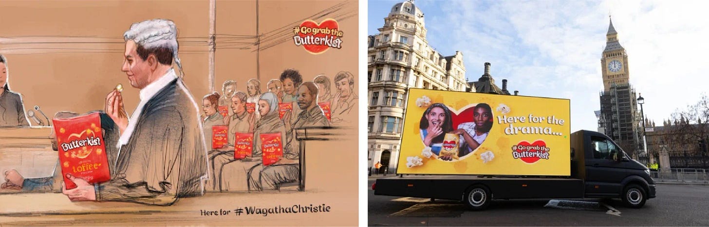 A more successful newsjack strategy has recently been rolled out by Butterkist, which has co-opted the “popcorn” emoji — used online for the social-media schadenfreude of rolling news drama — to hijack the “Partygate” scandal that embroiled Boris Johnson and the “Wagatha Christie” libel trial between Rebekah Vardy and Coleen Rooney, the wives of two British football players: