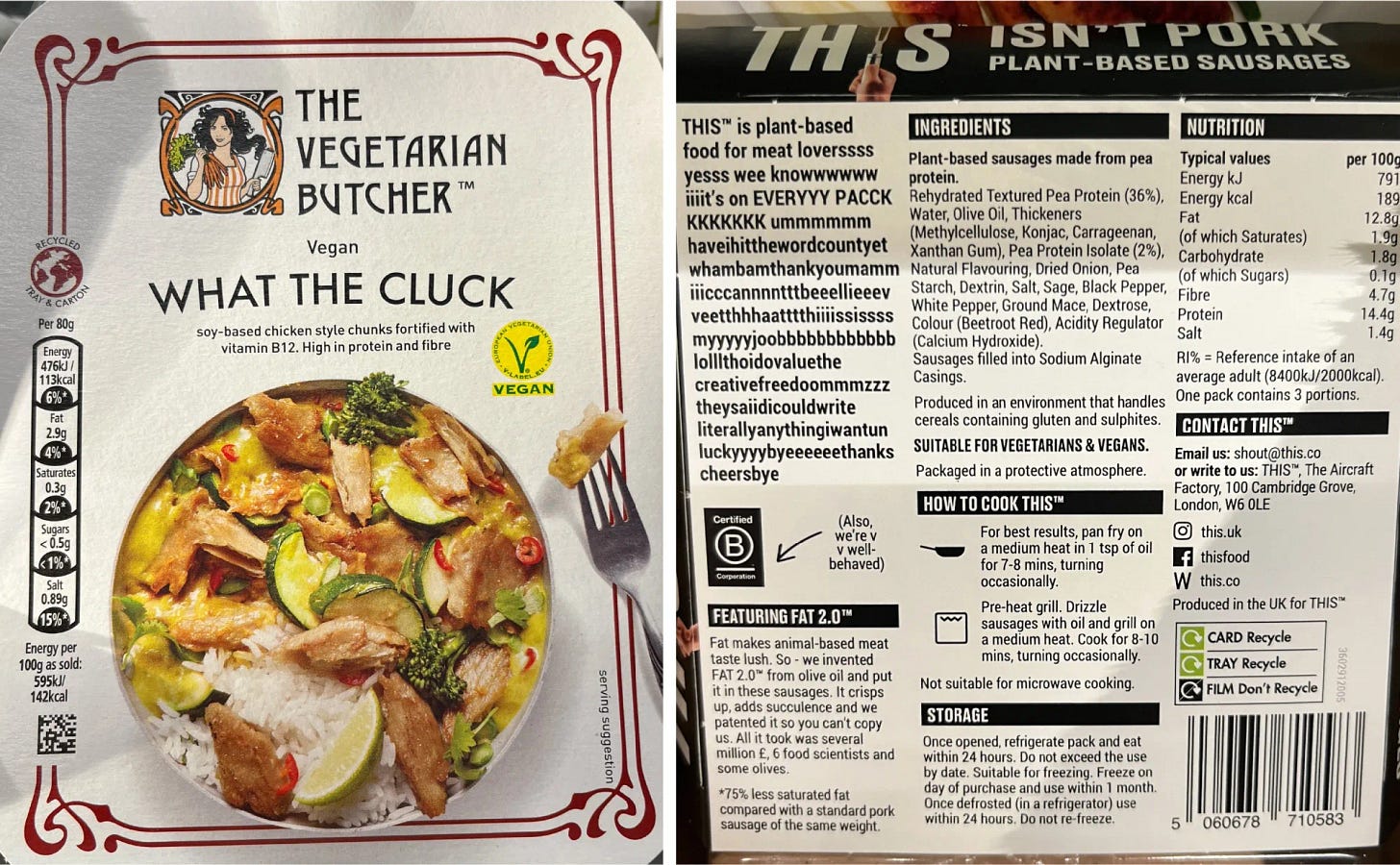 Given the task of tempting carnivores away from meat, it’s not surprising that plant-based food brands deploy wacky “I can’t believe it’s not butter” dazzle — both in naming (Beyond Meat, Impossible Foods, Tofurky) and packaging. Take the “soy-based chicken style chunks” from The Vegetarian Butcher called “What the Cluck,” or the plant-based “pork sausages” from This which are served with a side of Innocent-esque copy: