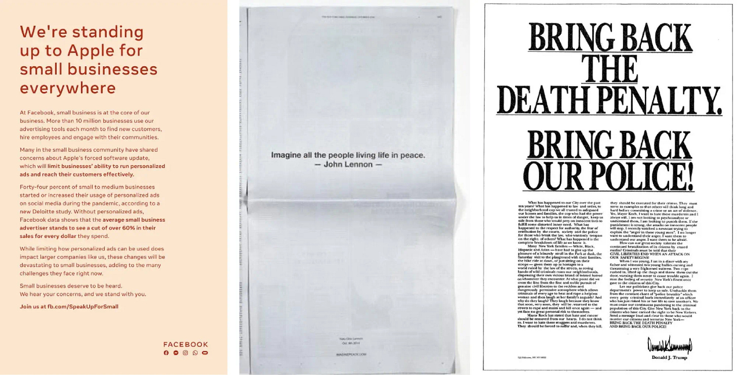 Tactical ads react instantly to a moment in time. The most basic iteration is a newspaper open letter calling, for example, for more consumer tracking (Facebook), world peace (Yoko Ono) or the return of the death penalty (Donald Trump).