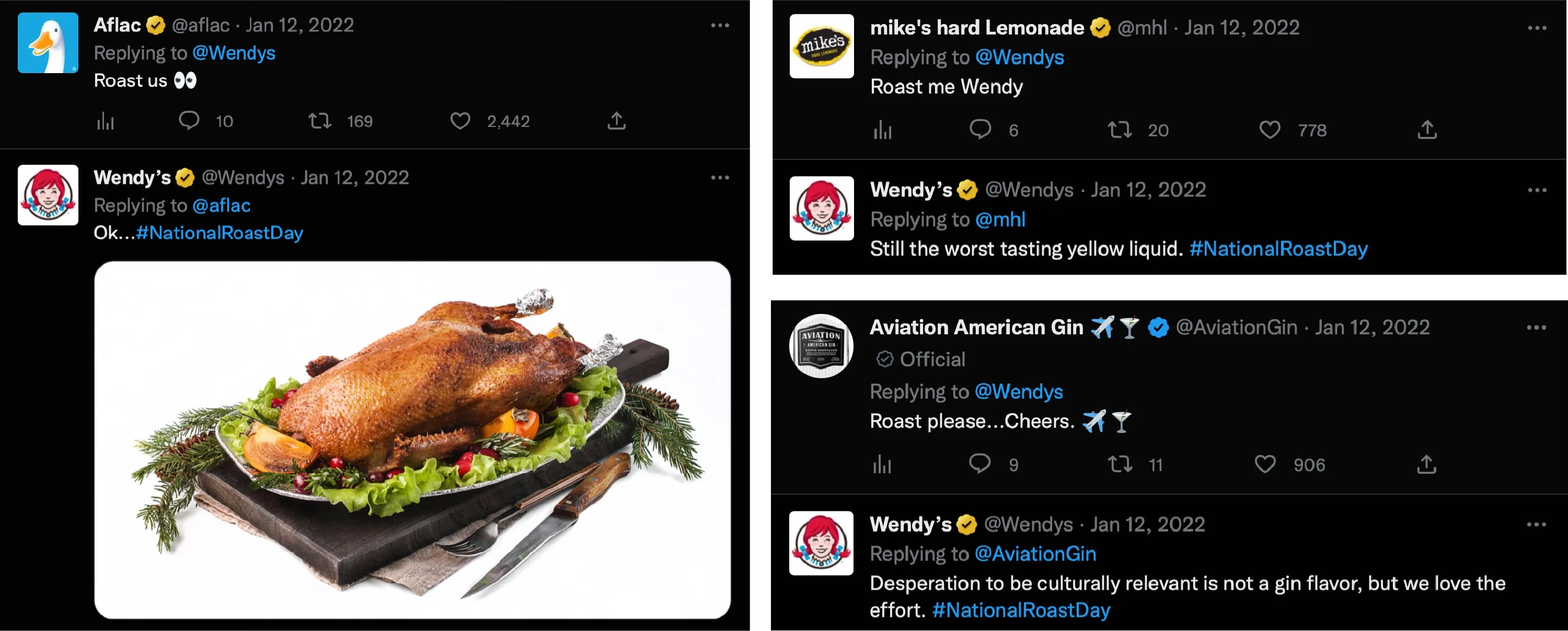 So eager is Wendy’s to cross tweets with others, it established “#NationalRoastDay” where brands as big as Aflac, Axe, Cinnab on, Coca Cola, Doritos, Gillette, Head and Shoulders, Monster Energy, Oscar Meyer, Oreo, Popeyes, T-Mobile, Triscuit, UPSand Yoplait beg to be insulted … and signal boosted.