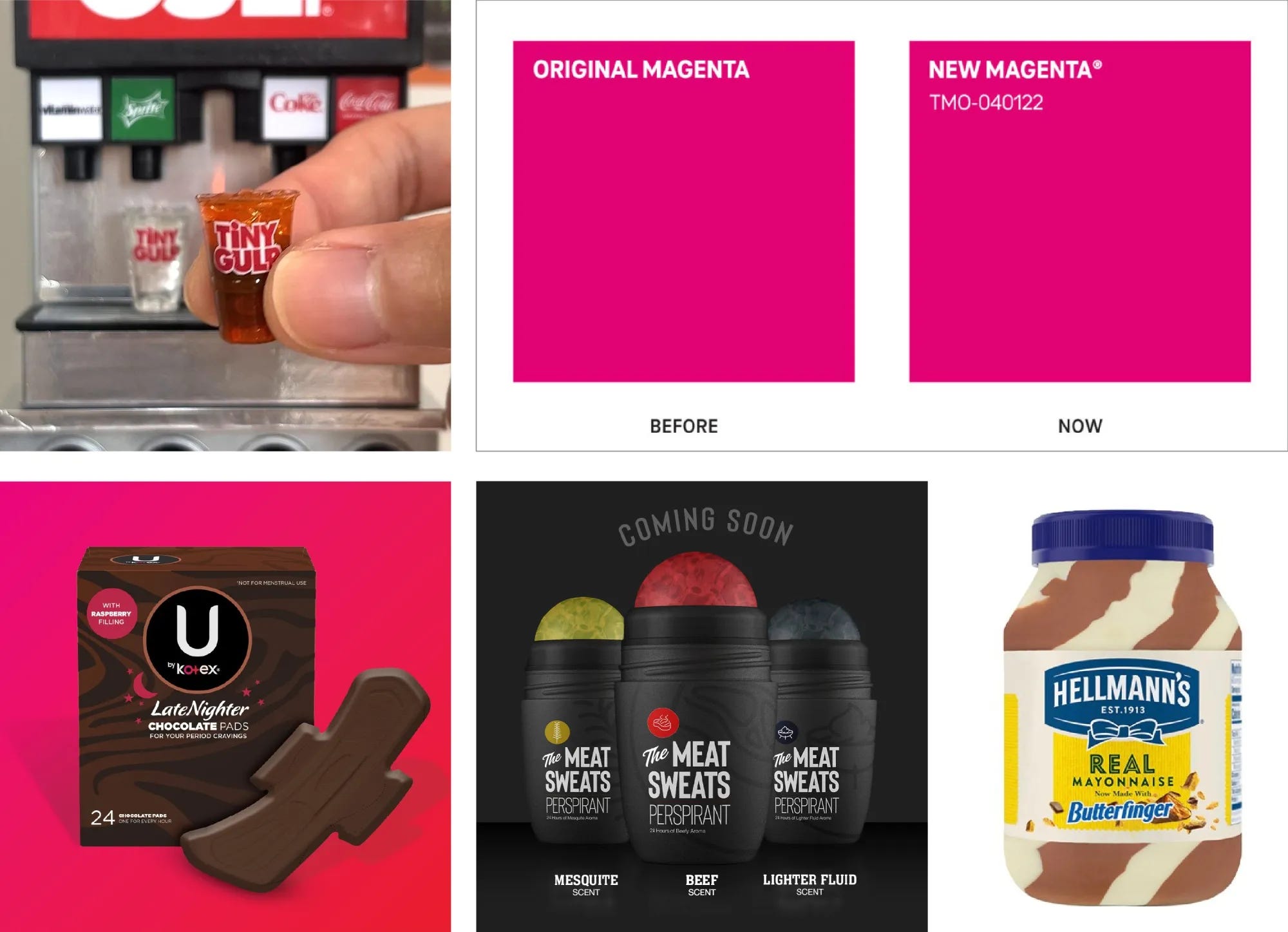 One April Fool’s Day saw, for example: Deliveroo ban pizza with pineapple; 7-Eleven launch a 0.7 ounce “Tiny Gulp”; the National Weather Service abandon Celsius and Fahrenheit for Kelvin; T-Mobile trumpet a “new magenta” that was (wait for it) identical to the old magenta; Kotex propose “Late Nighter chocolate pads,” with raspberry filling, “for your period cravings”; Omaha Steaks unveil “Meat Sweats” roll-on perspirants (original beef, lighter fluid and mesquite); and Hellman’s collaborate on “crispety crunchety” Butterfinger mayo.