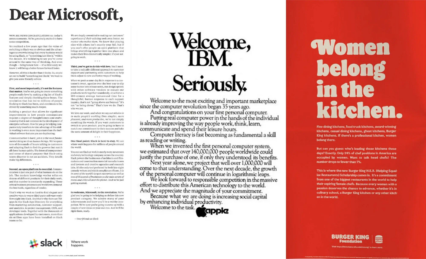 Such broadsides are rarely amusing, and when they attempt wit, risk stumbling into snide. Take Slack’s hubristic “welcome” letter to Microsoft Teams in 2016, which echoed Apple’s legendary 1981 “welcome” letter to IBM. Or Burger King’s 2021 “Women Belong in the Kitchen” manifesto, timed for International Women’s Day, which was widely derided as tin-eared.