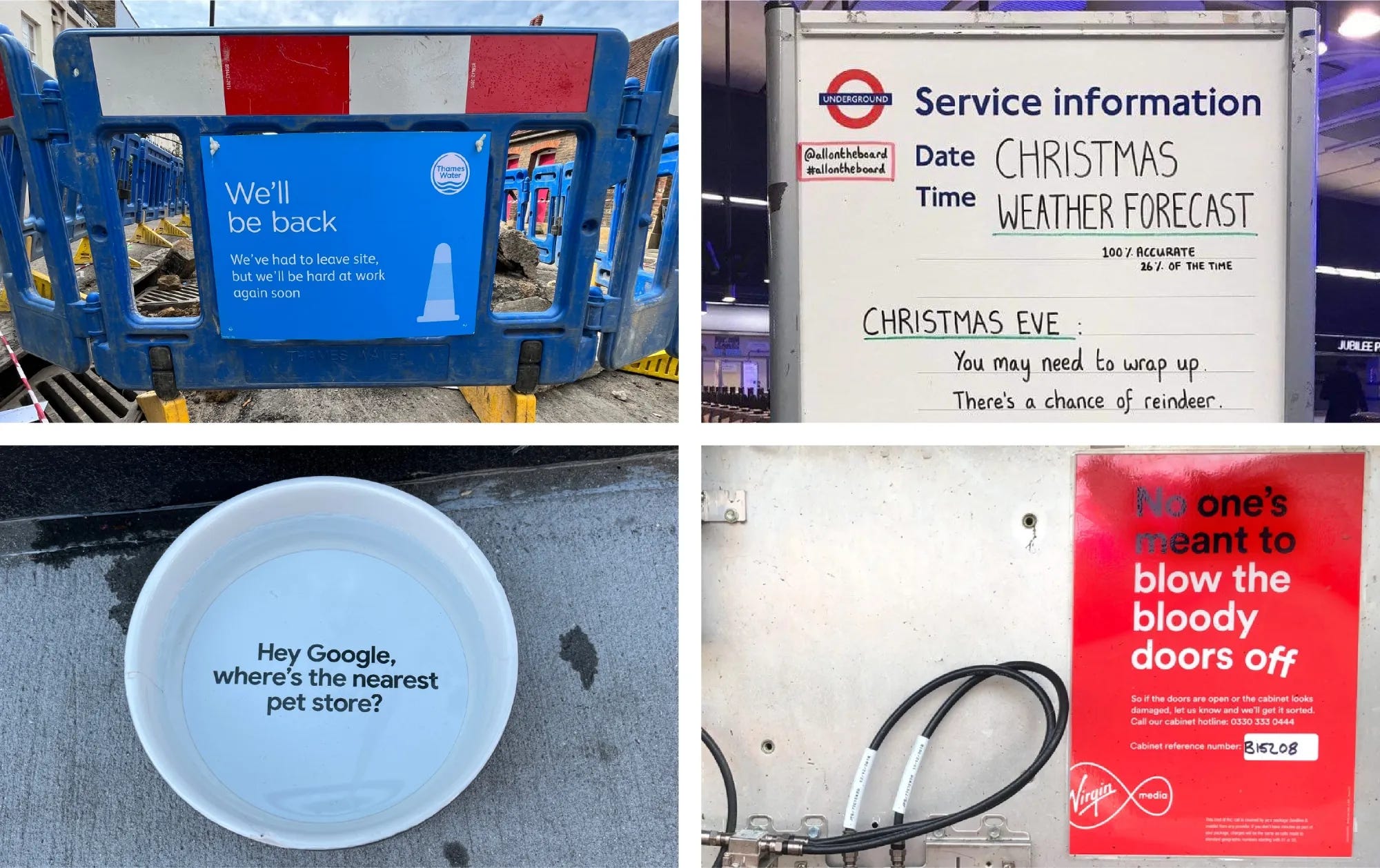To add insult to irritation, brandter is fast becoming the default voice for even non-commercial corporate interactions. Does every roadwork need a smile? Does every Tube ride require a gag? Does every dog bowl have to be knowing? Does every cable switchbox interior demand a joke?