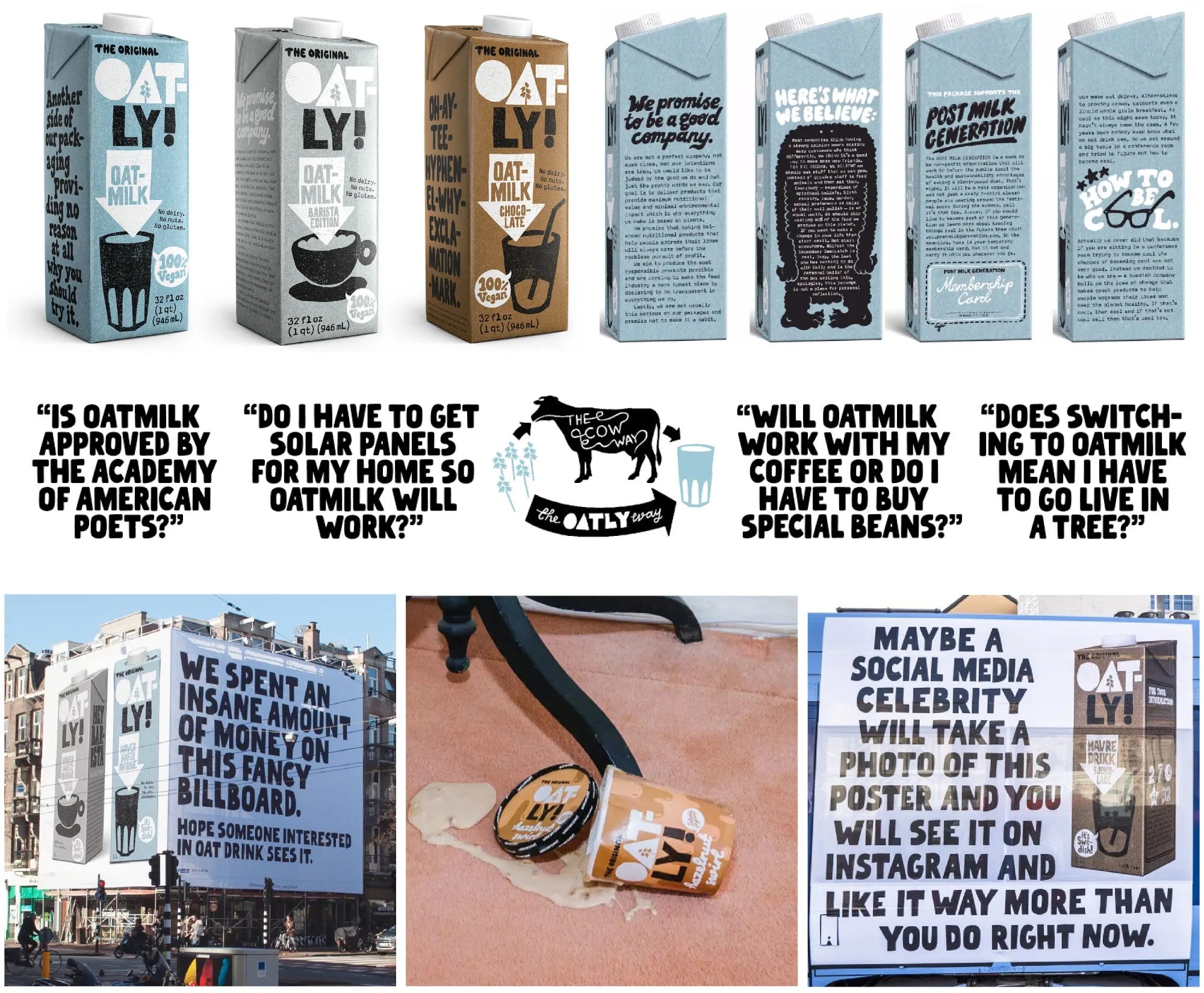 Designed to sound like “it’s made by a bunch of oat punks down in the basement,” Oatly’s brandter bellows from its products, ads and social feeds, combining maximalist copy with a Gen-Z vibe: